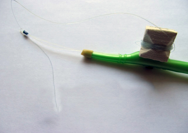 Затем поверх нитки нужно положить на рукоятку полоску изолона, покрытую с внутренней стороны клеем, сделав таким образом рукоятку. Ее можно зафиксировать обмоткой с двух сторон, но это не обязательно. Остается только согнуть проволочные выступы в крючки, на которых будет располагаться леска, и закрепить кивок - и удочка готова.